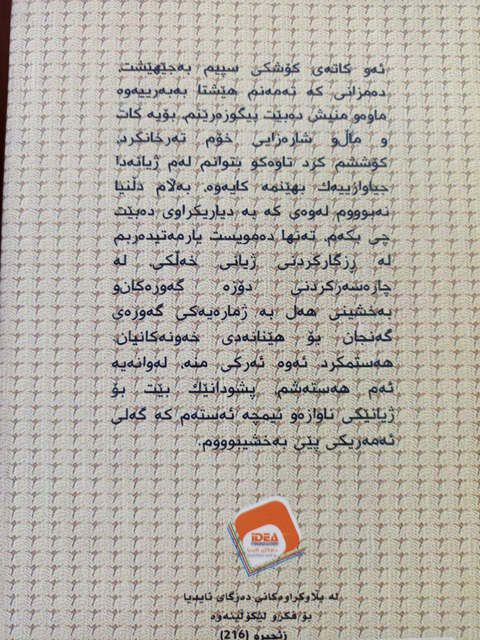 ئەو کاتەی کۆشکی سپیم بەجێهێشت،دەمزانی کە تەمەنم هێشتا بەبەرییەوە ماوەو منیش دەبێت بیگوزەرێنم،بۆیە کات و ماڵ و شارەزایی خۆم تەرخانکرد،کۆششم کرد تاوەکو بتوانم لەم ژیانە جیاوازە بمێنمەوە.